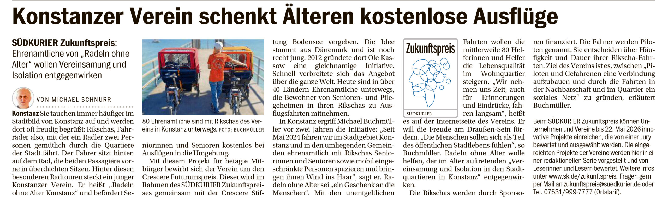 Seit Mai 2024 ist der Verein „Radeln ohne Alter Konstanz e.V.“ auf den Straßen von Konstanz unterwegs, um Senior:innen und Menschen mit mobiler Einschränkung ihr „Recht auf Wind im Haar“ zu erhalten.