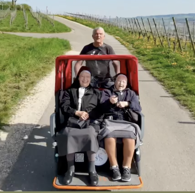 Kommen Sie mit auf eine kleine Rikscha-Tour mit unserem Piloten Harald und zwei Schwestern aus dem Kloster Hegne – hier klicken!